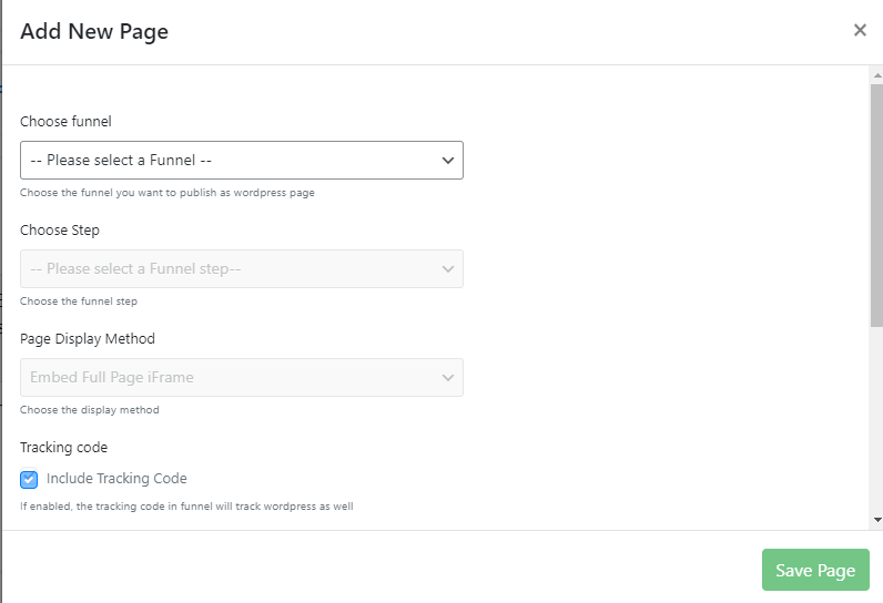 Page Display Method: Choose how you’d like the page to appear on your WordPress site. “Embed Full Page I-frame” is the recommended option. Tracking Code: If you want to use the tracking code you added in your HighLevel funnel settings, check this box to enable it on your WordPress site as well. It’s usually best to keep this enabled.