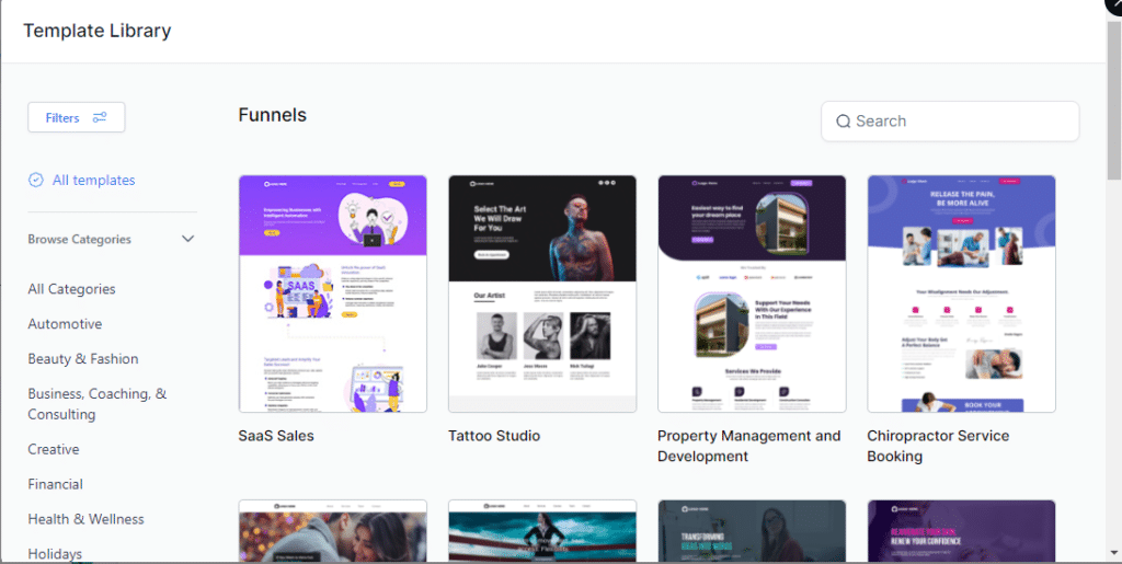 Create Funnels Using Templates: Building a funnel with templates is fast and straightforward. Once you select the “From Templates” option, you’ll be directed to GoHighLevel’s template library. From there, simply choose a pre-designed sales funnel and customize it to match your business goals and branding.