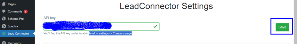 Copy your API key and paste it into the LeadConnector plugin settings within your WordPress dashboard. Then, click “Save” to apply the changes.