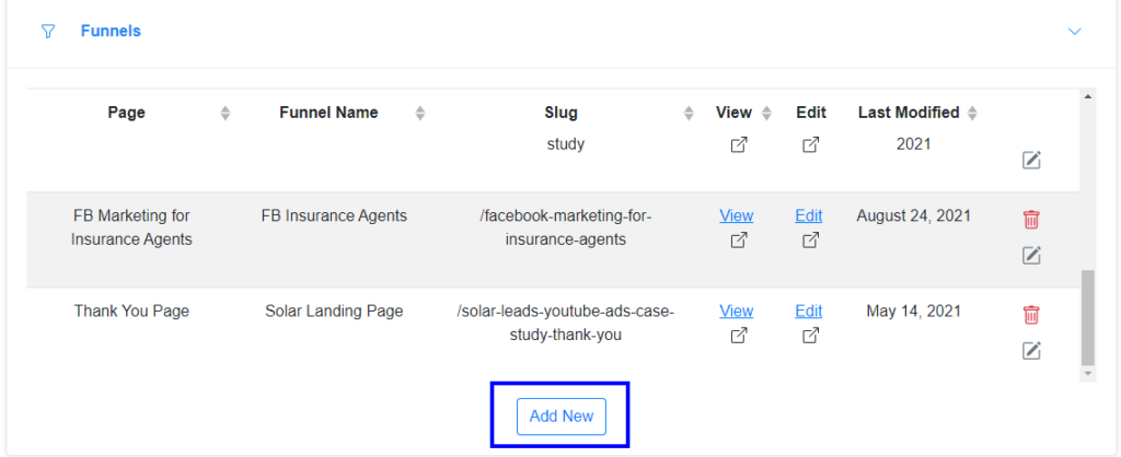 Once your API key is successfully verified, you can begin publishing your sales funnel on your WordPress site. To get started, open the Funnels dropdown menu and click “Add New.”