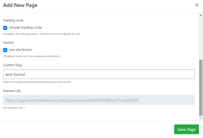 Use Site Favicon: Enable this option to display your WordPress site’s favicon on the funnel page. It’s generally a good idea to keep this enabled. Enter the Slug: This defines the URL path that appears after your domain name. You can simply use the name of your sales funnel here. Once you’ve entered the details, click “Save Page.” Your funnel will now appear under the Funnels section within the LeadConnector plugin.
