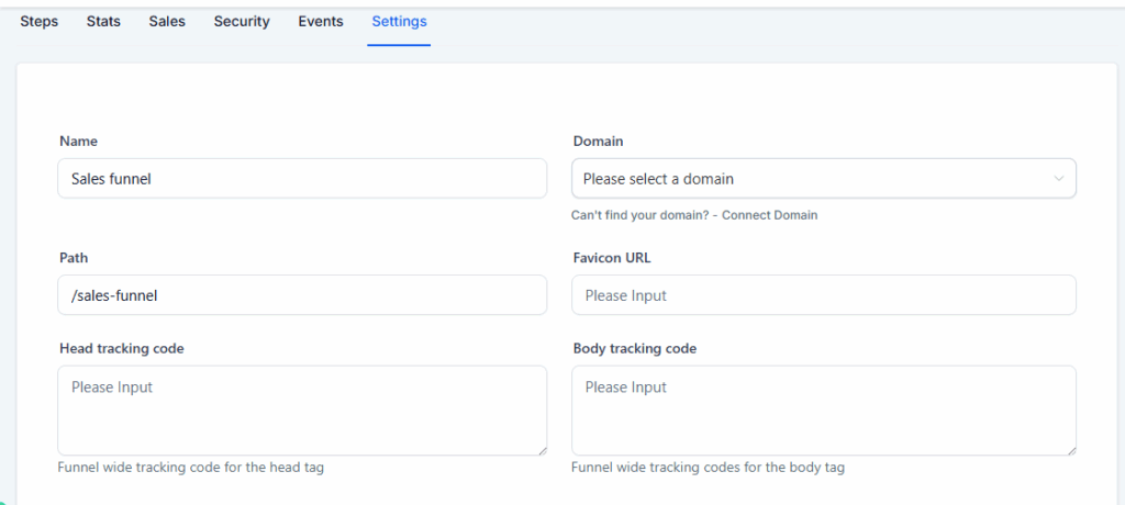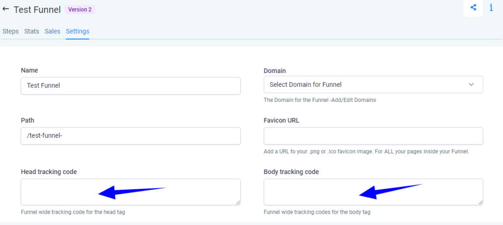 Go to your GoHighLevel dashboard and open the sales funnel where you want to add tracking. Click on the “Settings” tab, then paste your tracking code into either the Head Tracking Code or Body Tracking Code section, depending on the type of tracking you need.