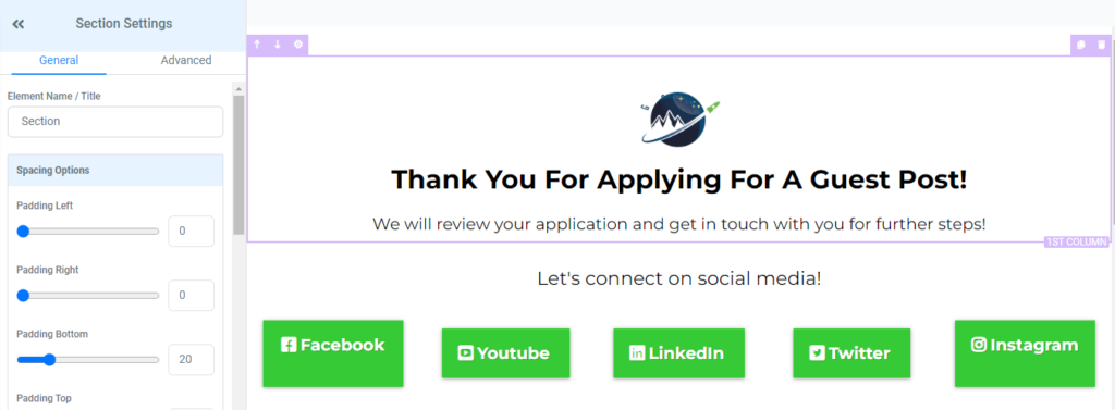 Building the thank you page follows the same process as the previous two pages. You can either import an existing page or create one from scratch. Typically, a thank you page is simple, featuring a message to express your gratitude. Additionally, you may choose to include social media links, like we did in our guest blogging thank you page example, to encourage further engagement.