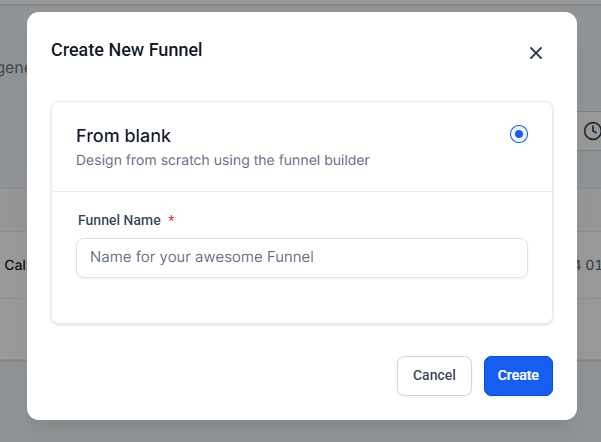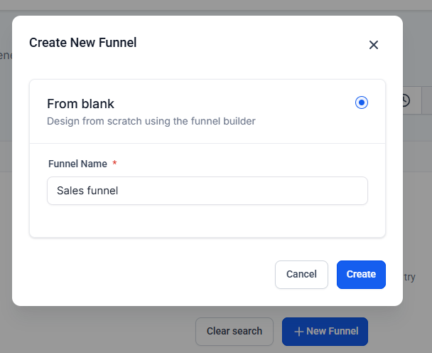 Create a Sales Funnel from Scratch: Select the “From Blank” option, enter a name for your funnel, and click “Create” to get started.
