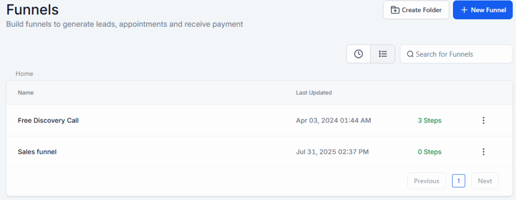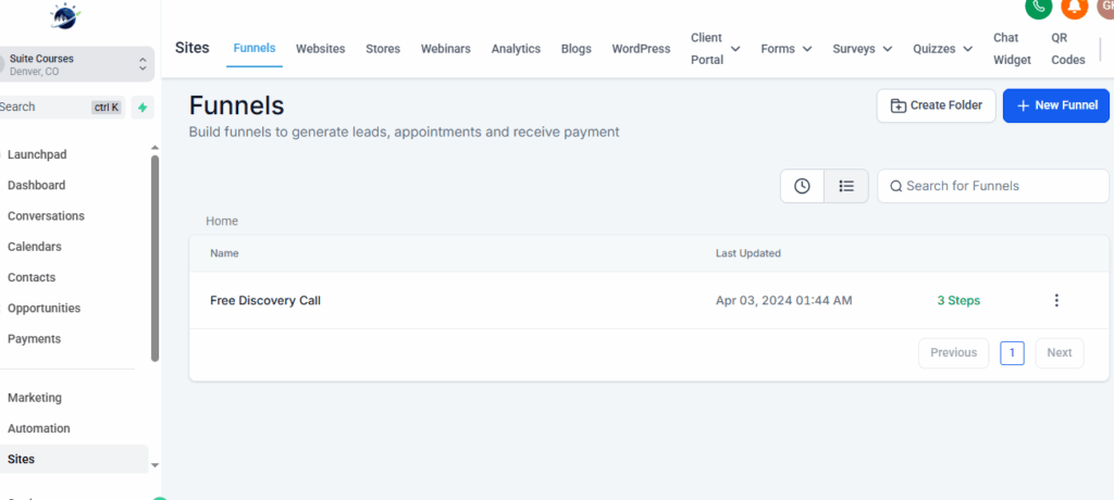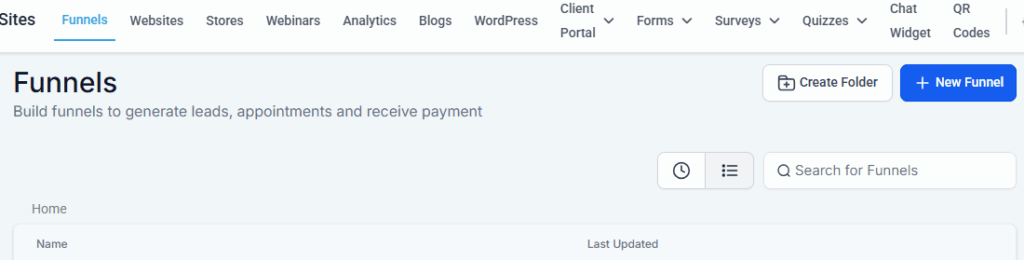 Log in to your GoHighLevel account and click on “Sites” in the left-hand menu. You’ll be directed straight to the “Funnels” tab. From here, you can view any existing funnels you’ve previously created or start building a new one. To keep things organized, GoHighLevel also offers a “Create Folder” option, perfect for grouping your funnels by type, project, or client.