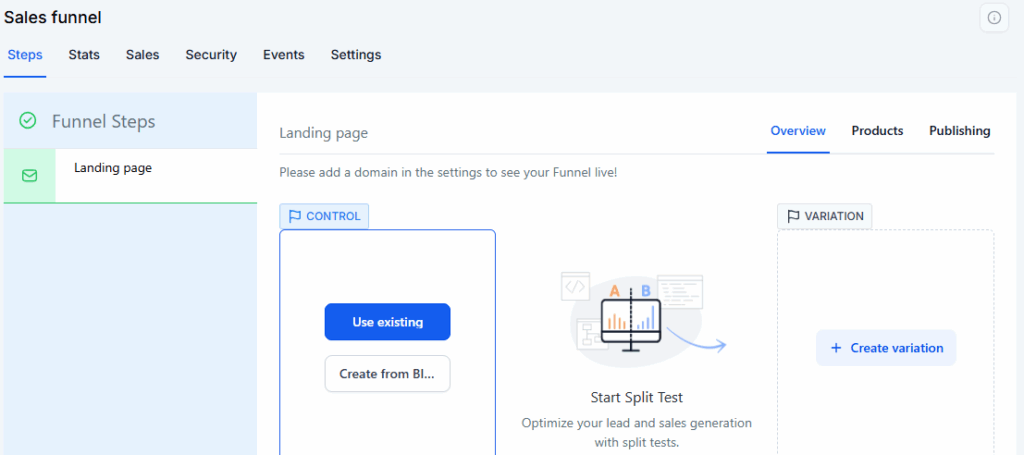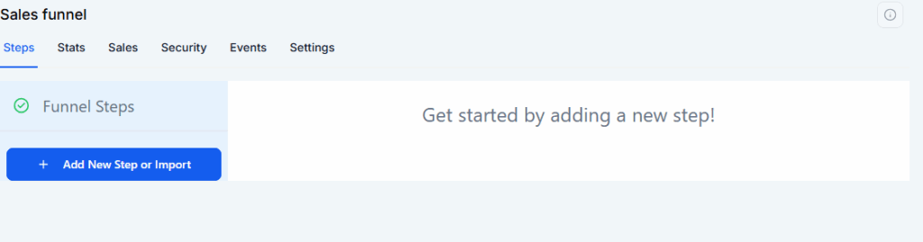 - Steps: This tab allows you to add and manage the individual pages (or steps) within your funnel.