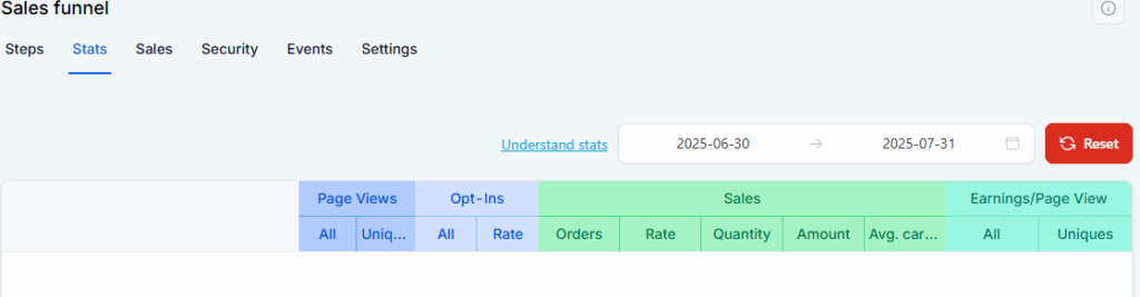 Stats: This tab displays the performance metrics of your funnel. It provides insights such as views, conversions, and conversion rates. Below is a screenshot showing the stats section from one of our existing sales funnels.