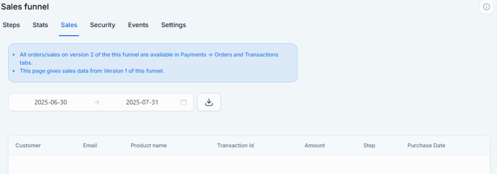 Sales: This section tracks any sales generated through your funnel, including payments received for products or services. Currently, this section is empty since no sales are being processed through this funnel at the moment.