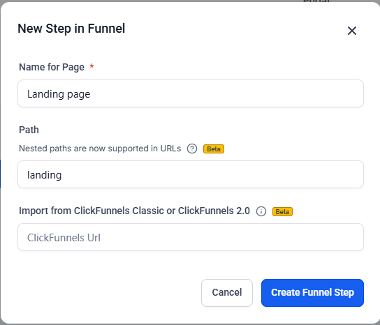 To create your landing page, click on “Add New Step.” A dialog box will appear prompting you to set up the new funnel step. Simply enter a name for the page and define the path (URL), then click “Create Funnel” to proceed.