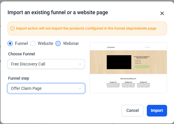 Create a Funnel Step Using Existing Pages: This method is a fast and efficient way to build your sales funnel. Simply click on the “Use Existing” option. Then, select whether you want to pull the page from an existing Funnel or Website. For example, choose “Funnel” to import a step from one of your previously created funnels. After that, just select the specific funnel and then the page you want to use, and click “Import” to add it to your current funnel.