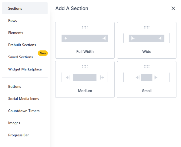 - Sections: Begin by adding sections to define the overall layout of your page. You can choose from layout options such as full-width, wide, medium, or small, depending on your design needs.