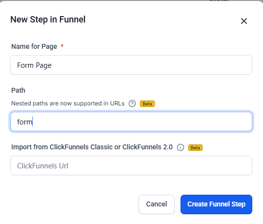 Next, click on “Add New Step.” Enter the name of your page and the URL path; this time, name it “Form Page.” Then, click “Create New Funnel Step” to add it to your funnel.