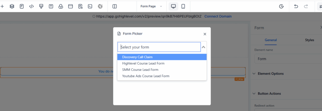 If you don’t see any domains listed in the dropdown, it means no domains have been added to your GoHighLevel account yet. In that case, you’ll first need to add the desired domain to GoHighLevel. Once added, you can return to this section and select the domain to publish your sales funnel.