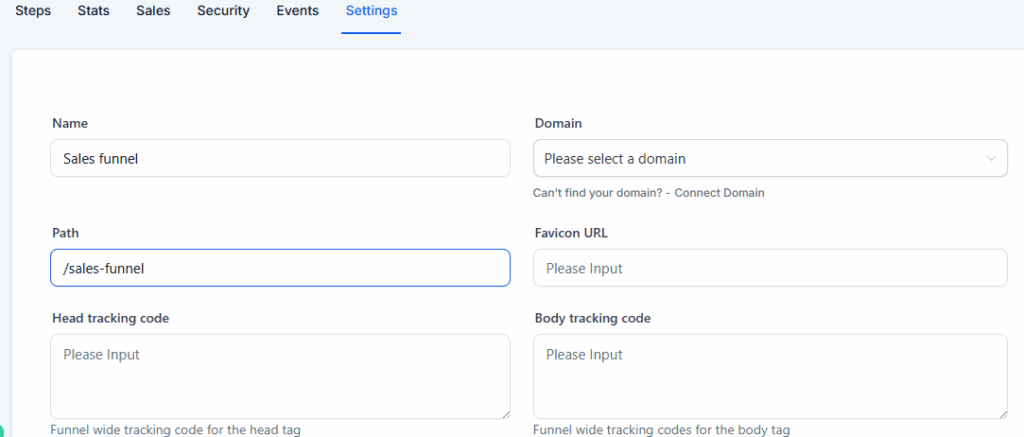 - Tracking Data: Insert tracking codes such as Google Analytics, Facebook Pixel, or other scripts to monitor and analyze your funnel page performance.